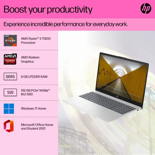 HP 15 Laptop (AMD Ryzen 3/ 8GB RAM/ 512 SSD/ 15.6 inch (39.6 cm) FHD Display/ Thin & Light/ AMD Radeon Graphics/ Win 11/ MS Office) 15-fc0026AU